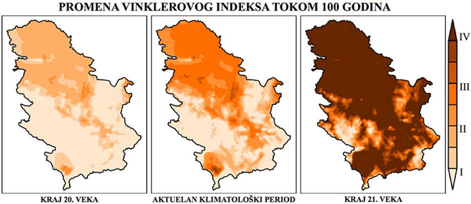 Tokom sledećih par decenija svi današnji vinogradarski rejoni preći će u III klimatsku zonu po Vinkleru, dok će se Južna Metohija i delovi Negotinske Krajine, Mlavskog, Beogradskog i rejona Tri Morave naći u toplijoj, IV klimatskoj zoni. Međutim, ukoliko se ne smanji emitovanje CO2, do kraja 21. veka svi današnjih vinogradarski rejoni u Srbiji naći će se u V klimatskoj zoni prema Vinklerovom indeksu, piše portal Klima101.