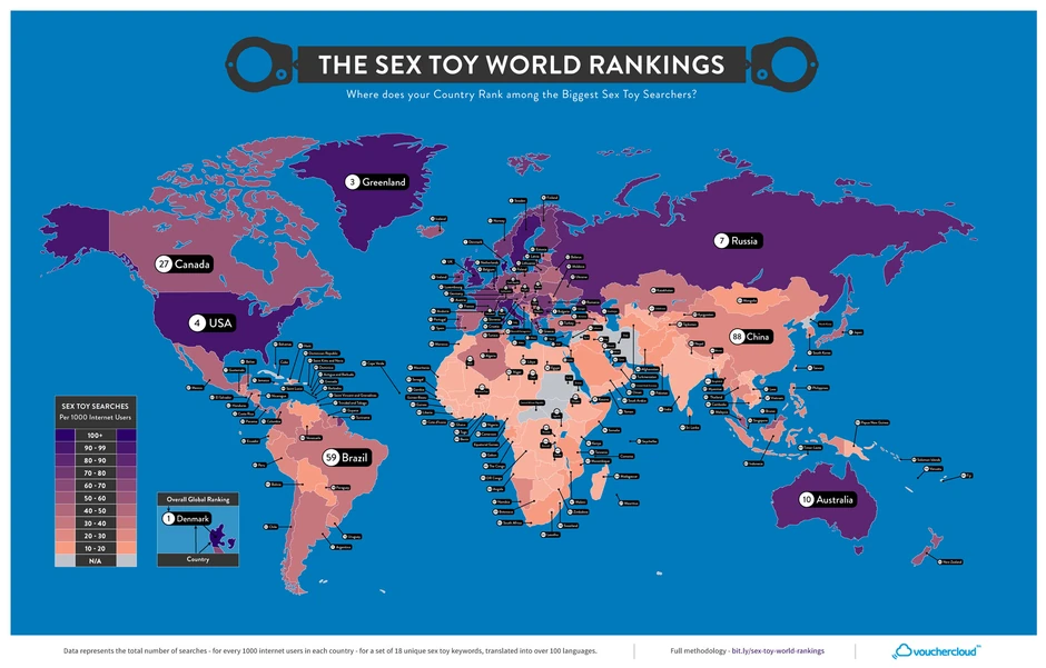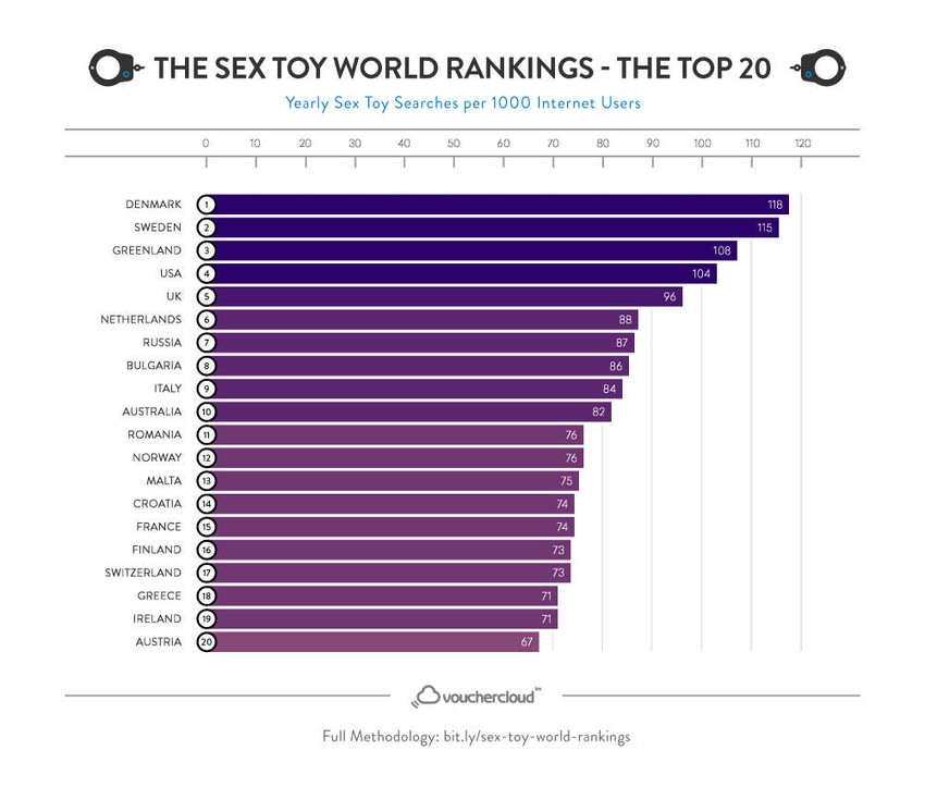 Danska je na prvom mestu, zatim slede Švedska, Sjedinjene Američke Države, koje imaju najviše ljubitelja seksi igračaka po glavi stanovnika, a slede ih Velika Britanija, Holandija, Rusija, Bugarska, Italija i Australija.