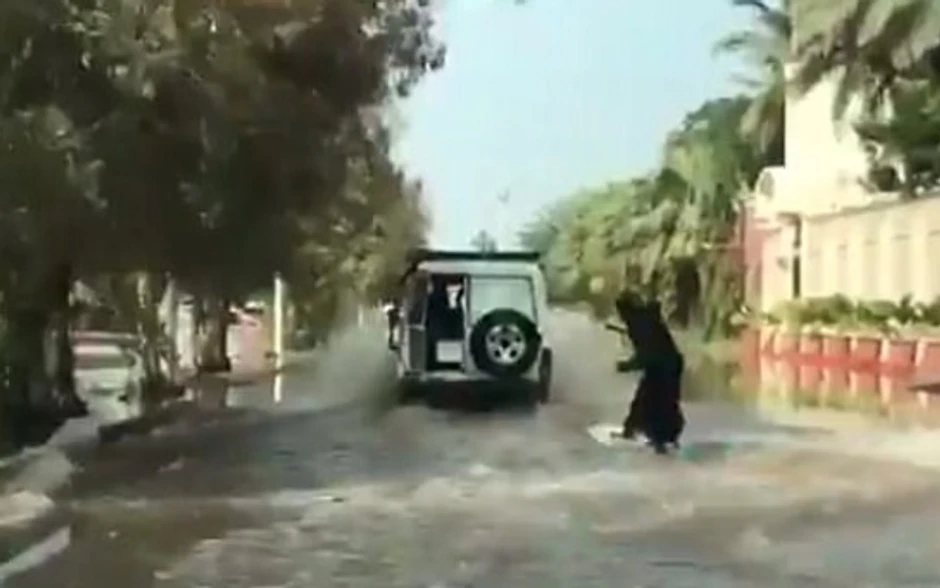 Osoba obučena u burku je snimljena kako surfuje zakačena za automobil po poplavljenim ulicama u Saudijskoj Arabiji.