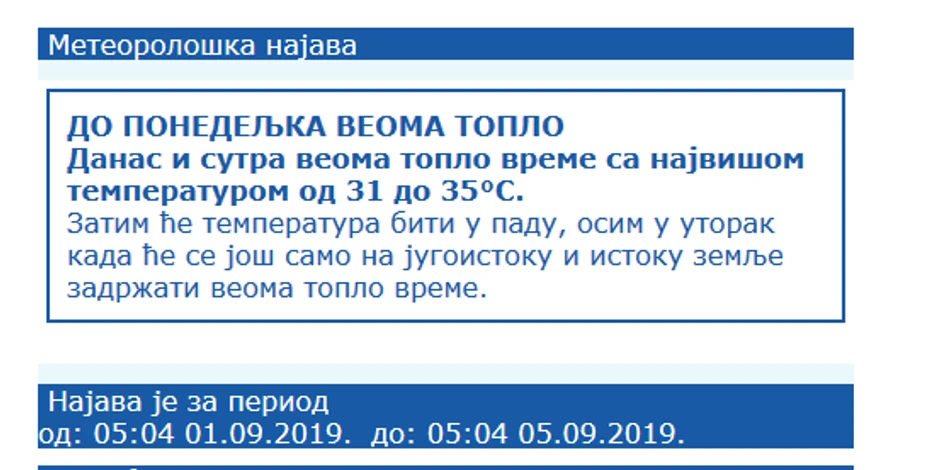 Još danas i sutra veći deo dana biće sunčano i vrlo toplo sa maksimalnim temperaturama od 33 do 35 stepena, ali se u noći ka utorku očekuje hladan front koji će našoj zemlji doneti pad temperature i ređu kišu, osim na jugoistoku i istoku gde će se do kraja dana zadržati veoma toplo vreme.