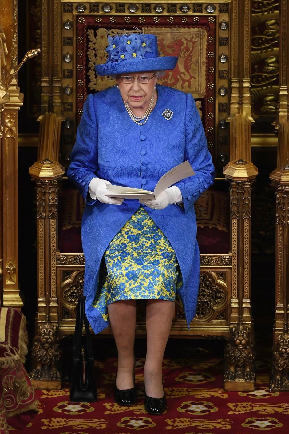 Njeno Veličanstvo je odabralo kraljevsko plavi šešir, koji se slaže sa garderobom koju je obukla, a na šeširu kao ukras stoji sedam plavih cvetova i svaki ima mali žuti krug u sredini, piše Jutarnji list.