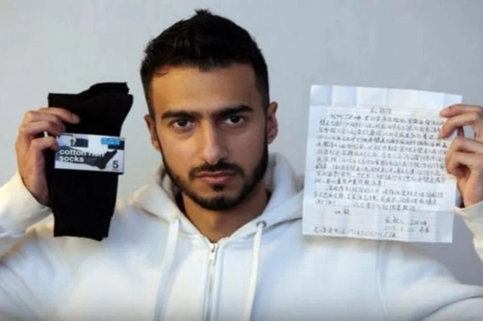 Mladić je kupio je crne pamučne čarape i tamo pronašao neobičnu poruku. Poruka je napisana na kineskom jeziku, a navodno ju je napisao zatvorenik koji ih je napravio.