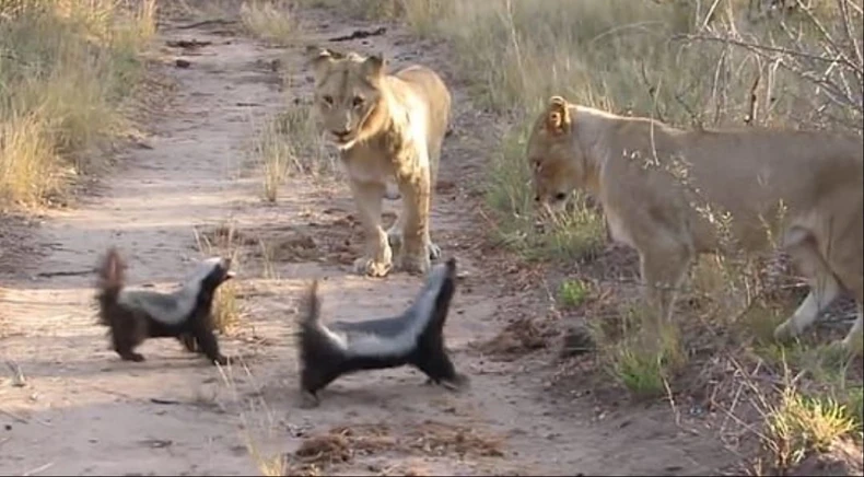 Radnik rezervata je snimio trenutak kada su se iznenada ispred dve lavice i jednog lava pojavila dva medojedna jazavca. Mali sisari, umesto da pobegnu od ogromnih predatora, nakostrešili su se i počeli da kidišu na lavove, sikćući na njih.