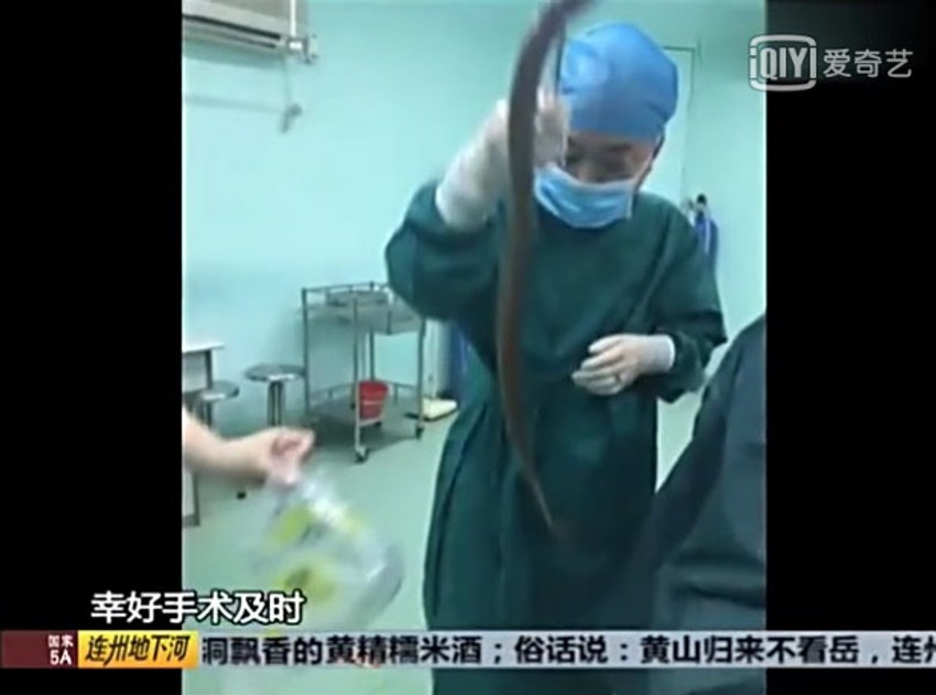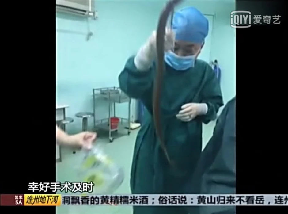 Lekar je hirurškim instrumentom izvukao nešto debelo i dugačko iz stomaka kineskog pacijenta i oslobodio ga užasnih bolova. Bila je to jegulja monopterus albus, koja se u primorskim krajevima Kine smatra delikatesom.