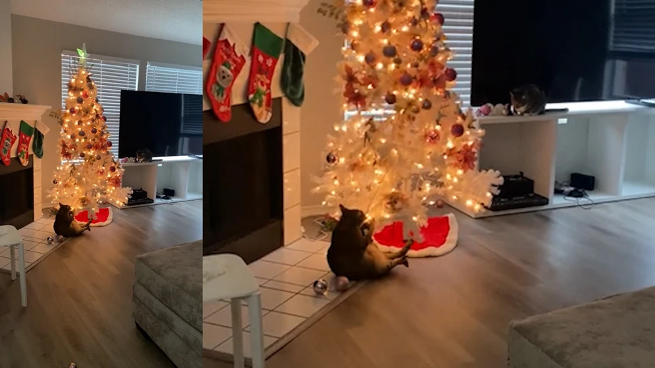 Kako je povukla jelku na pod, svi ukrasi su se rasuli po podu, a jelka sa lampicama završila je preko mačke.