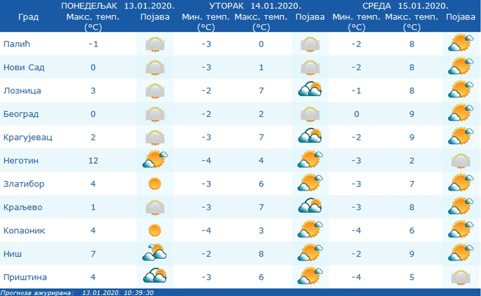 - Očekuju se magla i niska oblačnost tokom cele večeri i noći. Biće hladno, moguća je pojava poledice jer temperatura neće prelaziti nula stepeni - kažu za "Blic" iz RHMZ.
