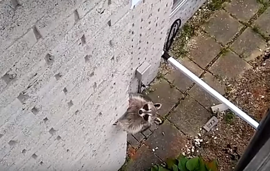 Jedan mali rakun je hrabro krenuo u pohod na zid, ali se onda uspaničio. Srećom njega je pomno posmatrala njegova mama.