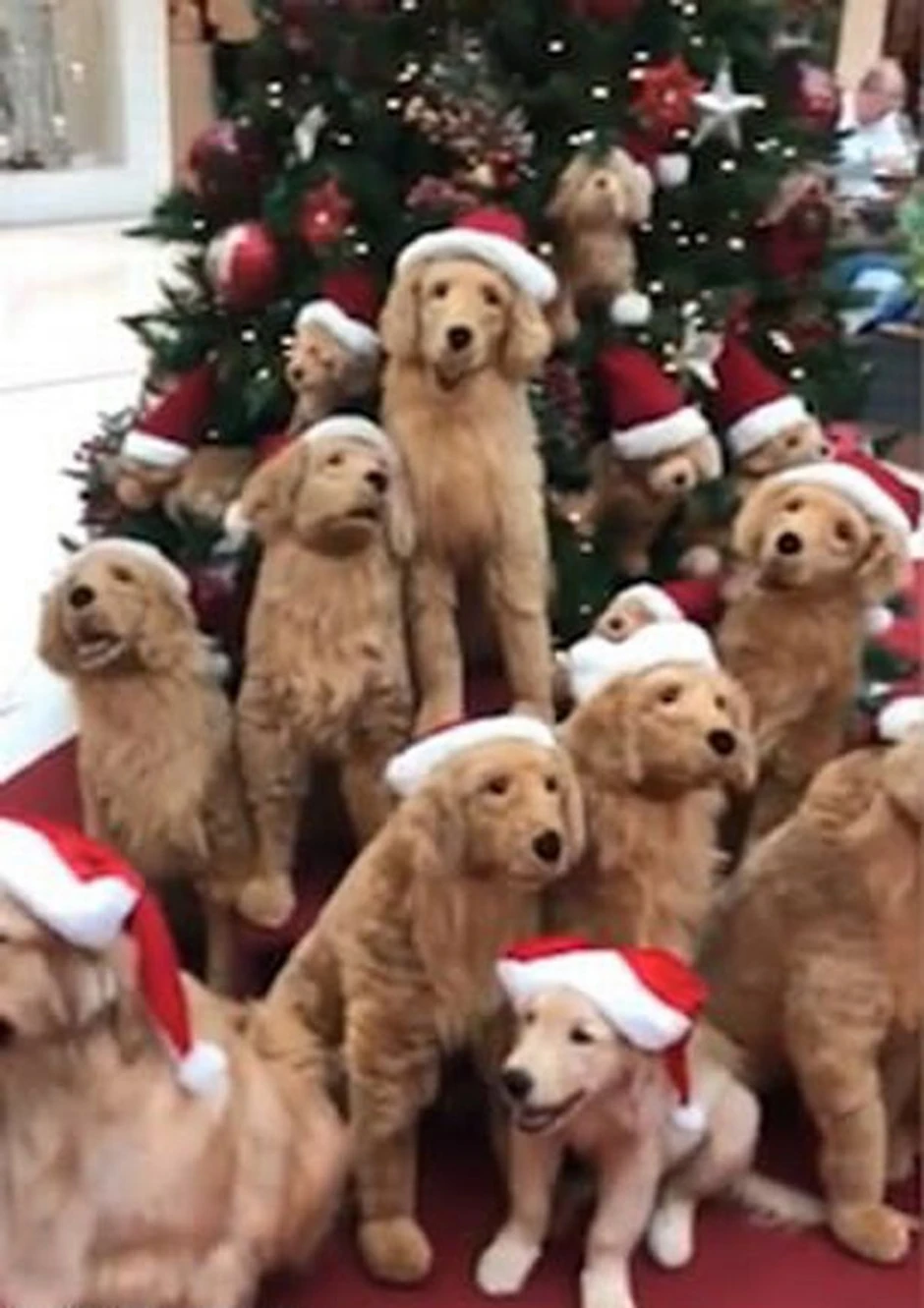 Oko njih deset mehaničkih pasa različitih veličina pomeraju svoje glave ispod drveta – koje je ukrašeno ukrasima u obliku malih zlatnih retrivera, koji takođe nose kapice.