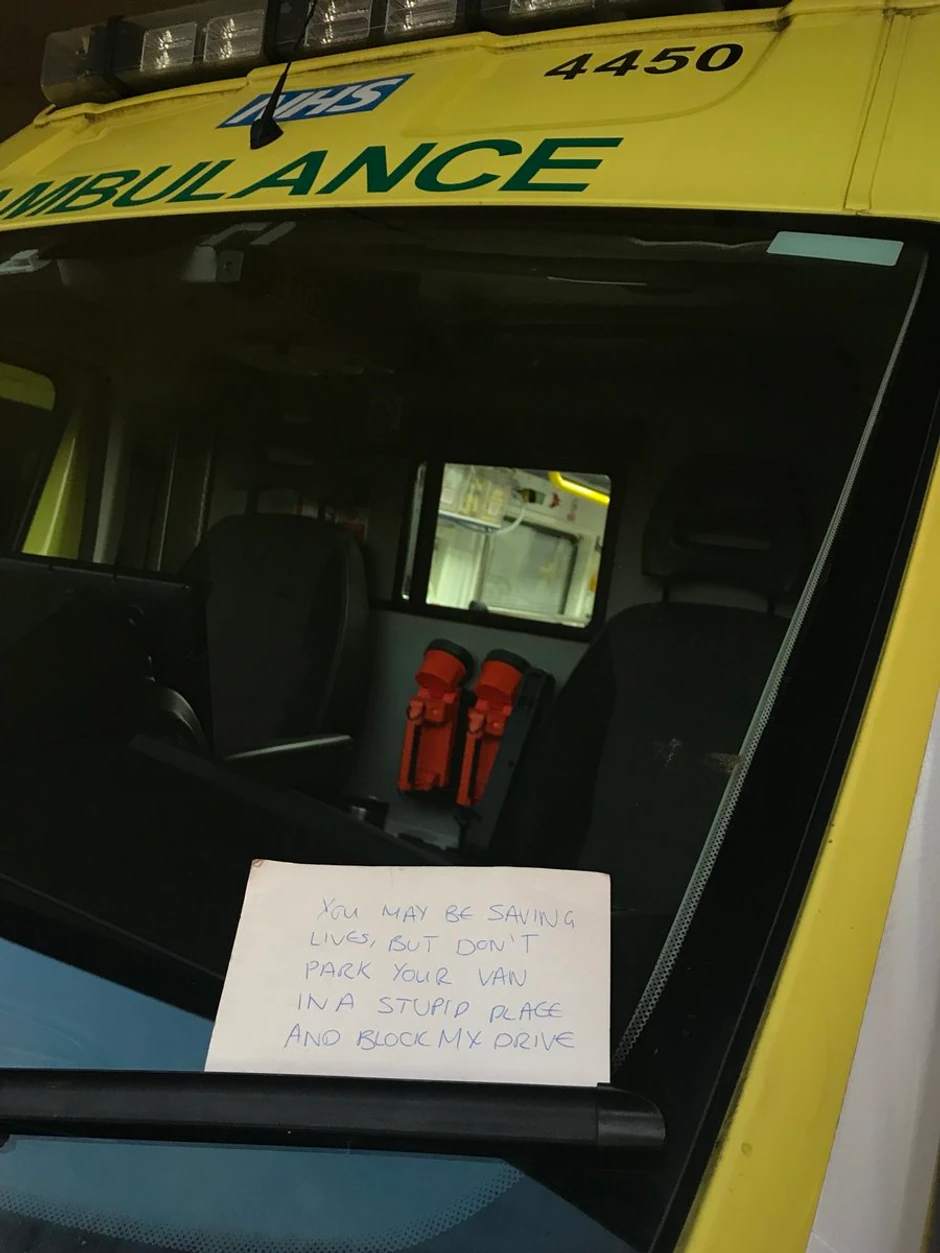 Dok su lekari hitne pomoć u Birmingemu pokušavali da spasu život čoveku koji je povraćao krv, njegovog komšiju je više brinulo što su se parkirali ispred njegovog ulaza. Zbog toga im je na kolima ostavio poruku sledeće sadržine: