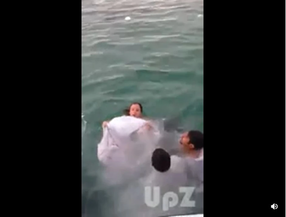 Mladoženja, koji je prvi skočio u vodu, krenuo je da se brčka čekajući mladu da mu se pridruži, a kada je i ona učinila isto, svi gosti su krenuli da vrište. Balska haljina od nekoliko slojeva brzo joj je prekrila glavu i potopila je, te je počela da se davi, a akciji spasavanja brzo se priključio i mladoženja.