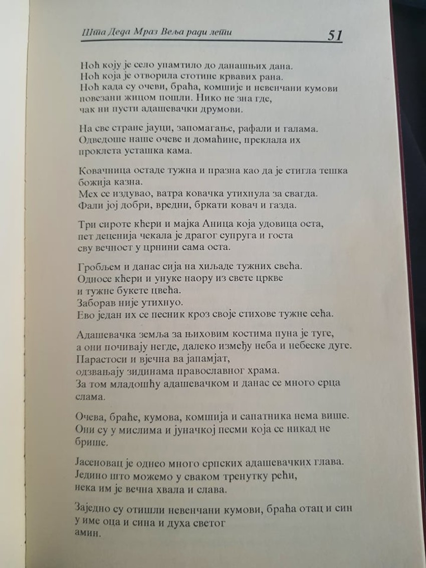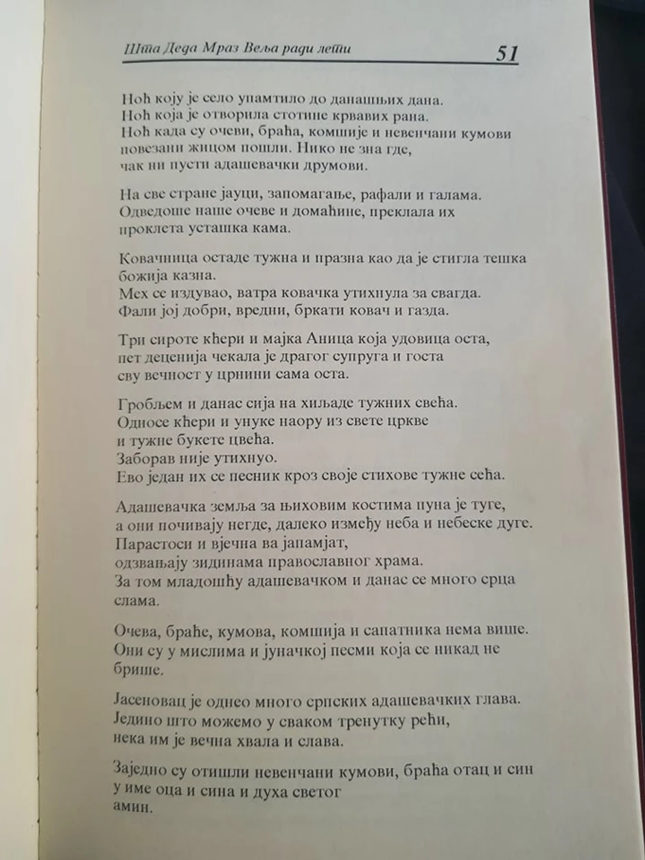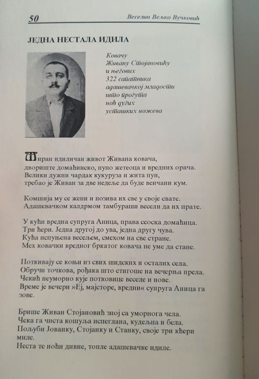"Kovaču Živanu Stojanoviću i njegovih 322 sapatnika adaševačkoj mladosti što proguta noć dugih ustaških noževa