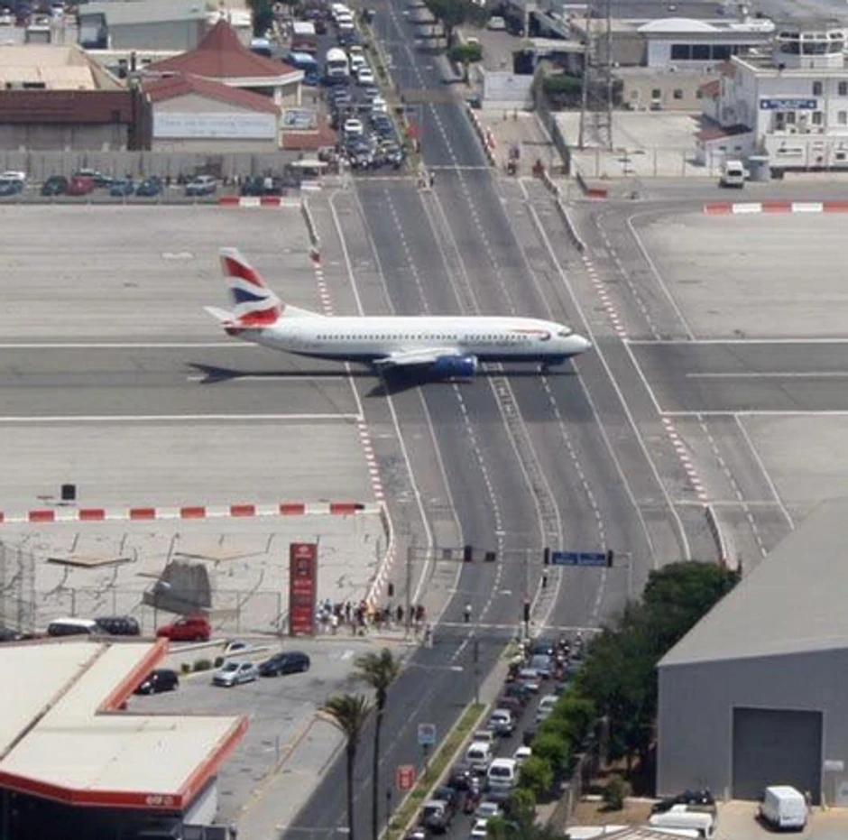 Ovo nisu jedine neobičnosti u vezi sa Gibraltarom. Ako dolazite avionom, sletećete na pistu dugu 2.000 metara, koja je sa leve i desne strane okružena morem. Ako dolazite kolima, moraćete da pređete preko nje, a tada može da vam se dogodi da se zaglavite u saobraćaju neposredno po prelasku granice sa Španijom. Avionski saobraćaj ima prednost u odnosu na drumski, pa automobili i pešaci više puta dnevno moraju da sačekaju u proseku desetak minuta (ponekad i dva sata) ispred rampe (onda kada avioni sleću ili poleću).