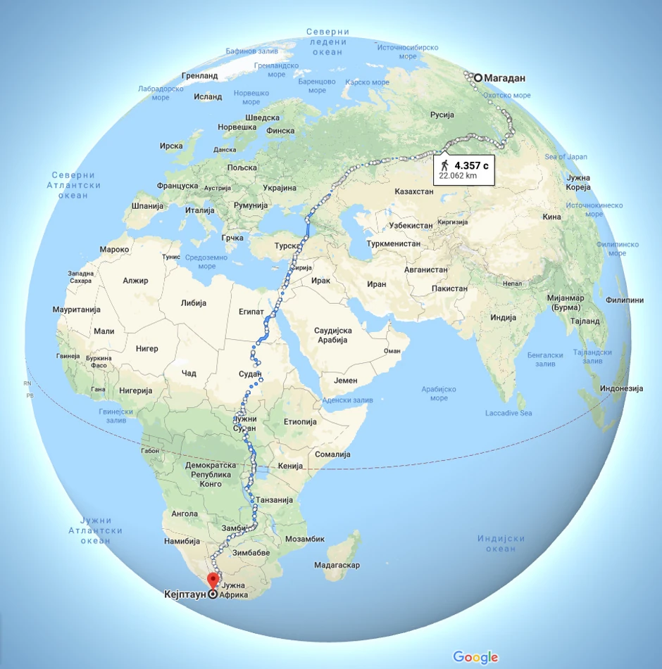 U pitanju je staza duža od 22.530 kilometara od L’Agalasa u Južnoj Africi do Magdana u Rusiji. Prelazak tog puta trajao bi tri godine ukoliko bi dnevno prelazili 20 kilometara, preneo je “Njuzer”.