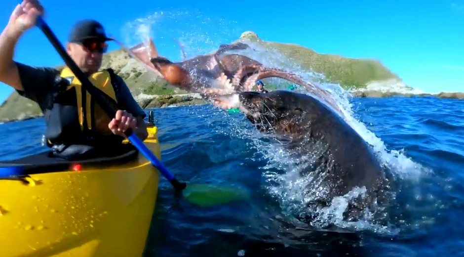 Taijo Masuda (23) vozio je kajak za “GoPro” kod obale Novog Zelanda 22. septembra, kad je snimio scenu koja je sada osvojila internet. Sve se dogodilo u trenutku – foka je izronila blizu kajakaša vukući hobotnicu, te zamahnula glavom udarajući čoveka mekušcem. Kajakaš Kajl Malinder je ostao zapanjen.