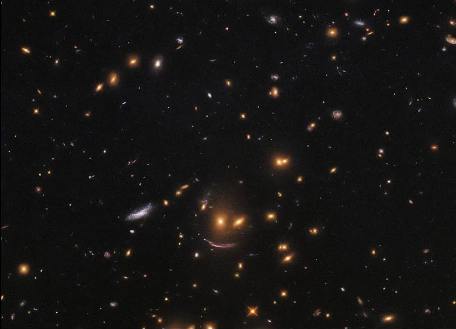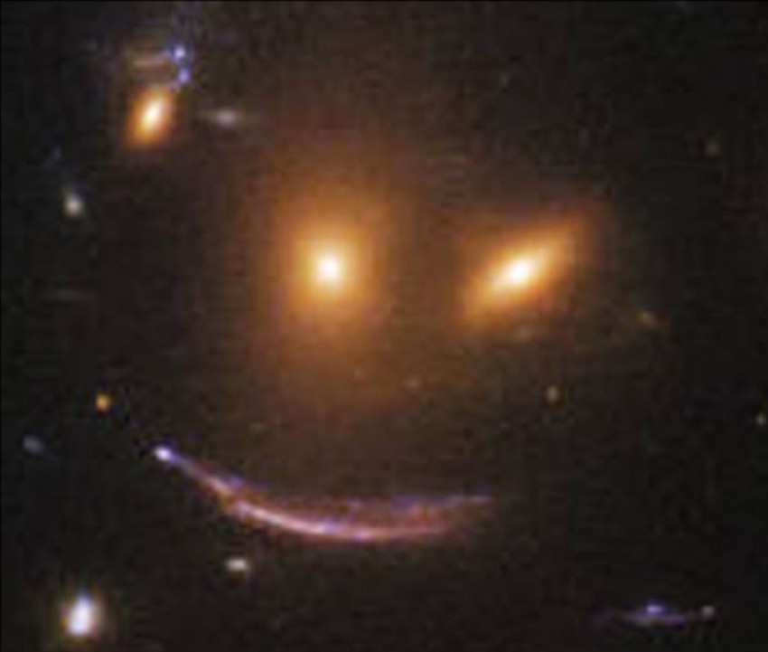 Okruženo galaksijama svih oblika, boja i veličina, ovo "lice" ima "oči" , koje su zapravo dve veoma svetle galaksije, a linija koja čini osmeh je zapravo luk izazvan efektom poznatim kao gravitaciono sočivo.