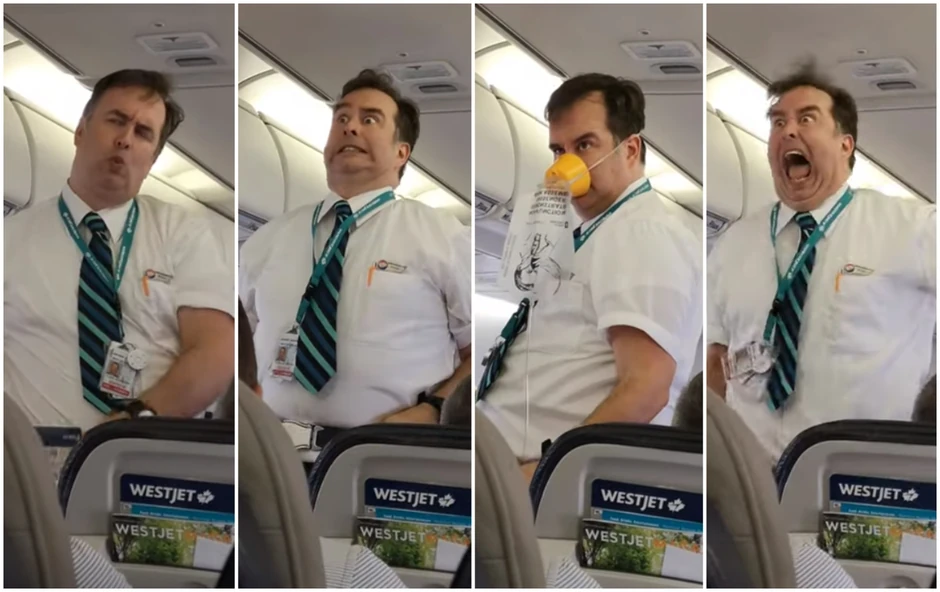Prava petominutna predstava zatekla je i dobro nasmejala putnike leta kompanije "Westjet" od Alberte u Kanadi do Arizone u SAD. Umesto uobičajene ukočene, čak i nezainteresovane demonstracije bezbedonosnih i ostalih mera u avion, stjuard je izveo skeč koji su oduševljeni putnici i snimili.