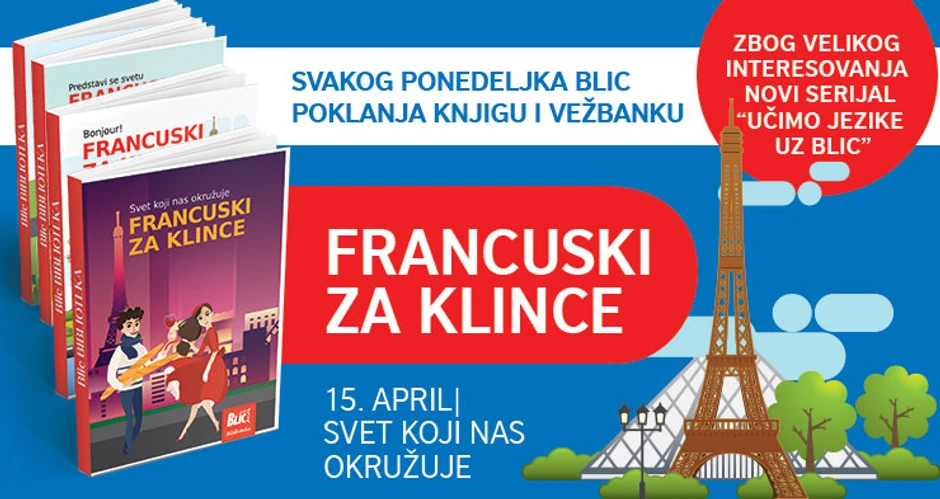 U ponedeljak, 15. aprila, uz „Blic“ na poklon nova knjiga „Francuski za klince“ sa osnovnim lekcijama iz ovog jezika.
