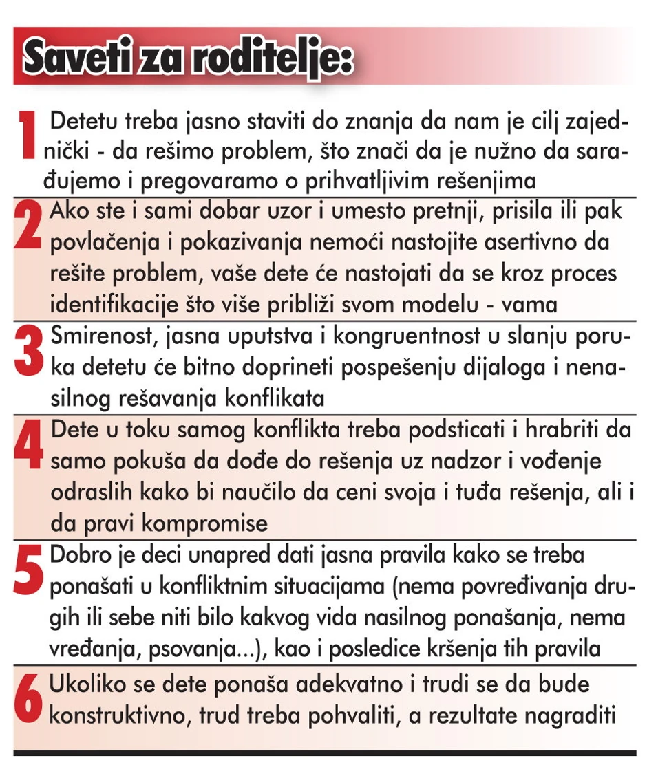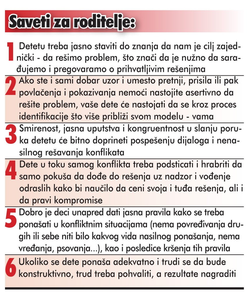 Tuče, vređanje, ismevanje samo su neki od načina na koji deca, naročito u mlađim razredima osnovnih škola, međusobno rešavaju probleme. Kako bi se ovo izbeglo, stručnjaci smatraju da je decu potrebno naučiti da konflikte rešavaju razgovorom, a ne pesnicima i uvredama, dok roditelje savetuju da nikako ne rešavaju konflikte umesto dece.