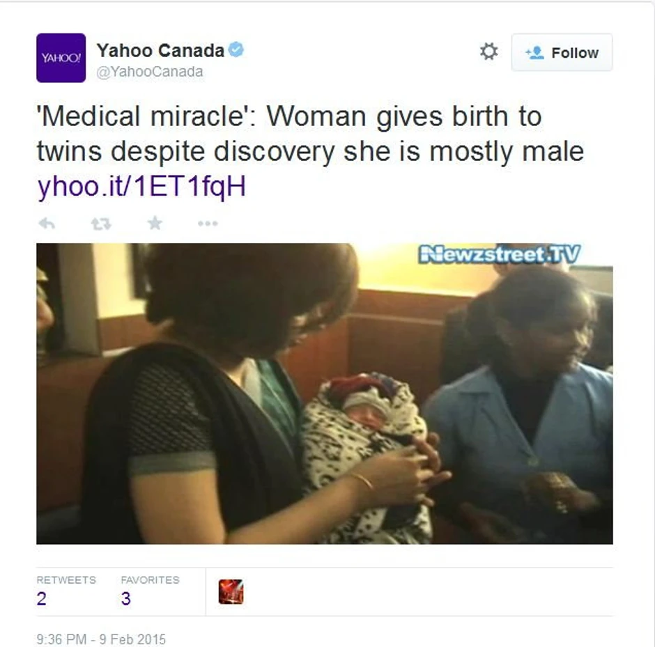 Tridesetdvogodišnja Indijka Maja Šarma, za koju je ustanovljeno da ima 95 odsto muških hromozoma, rodila je zdrave blizance nakon tri godina lečenja neplodnosti.