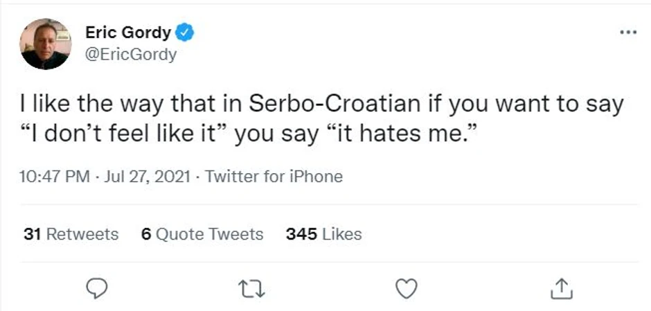"Sviđa mi se kako u srpskohrvatskom, ako želite da kažete kako da vam se nešto ne da, kažete 'mrzi me'", glasio je njegov tvit, koji je bio zabavnog i informativnog karaktera za one koji baš i ne poznaju naš jezik.