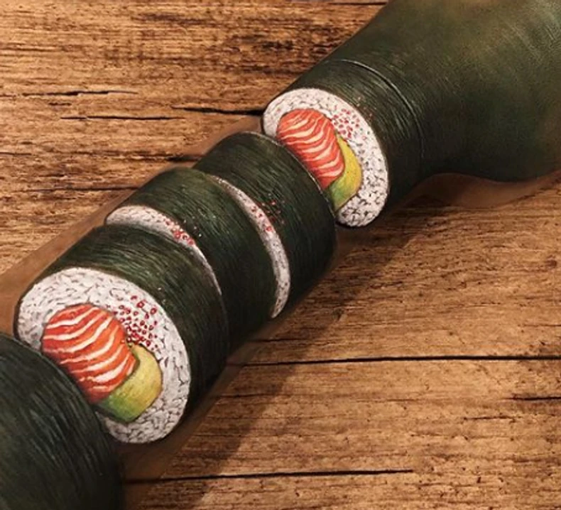 Ovaj put, ona je iskoristila vešte ruke, kreativnost i boje d aod sveoje ruke napravi ni manje, ni više nego suši. A kada je iluzija bila gotova, gotovo niko nije mogao da kaže šta je prava podloga stola, a šta njena ruka.