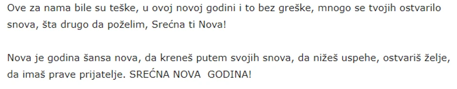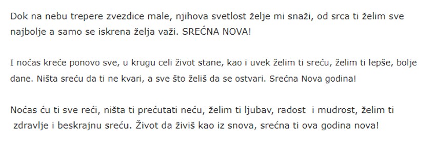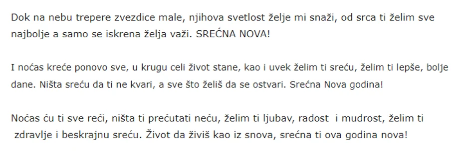 Poruke napisane u rimi samo zvuče lepo, ali kad nekome pošaljete na Viber poruku sadržine "U ovoj godini završi sve ono što u prošloj nisi, želim ti napredak na svakom polju i da znaš, važan ti si. Da za sve izazove imaš volje, da ti u ovoj godini sve krene na bolje i da uvek nasmejan i blag, zaslužuješ sve najbolje jer si zaista drag. Srećna Nova godina!" nemojte se čuditi ako vas ta osoba blokira, pa i počne da prelazi na drugu stranu ulice kada se sretnete.