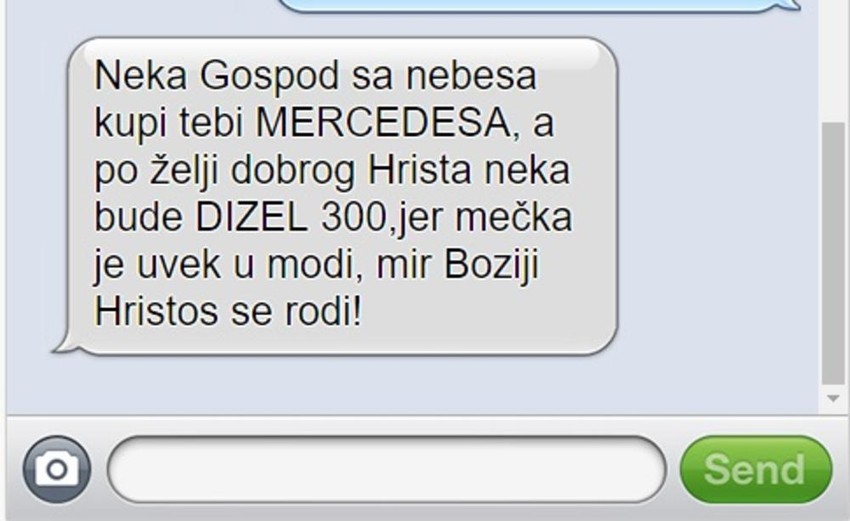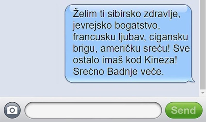 Ako ste mislili da kraj ovakvih poruka dolazi sa prvim danom Božića, prevarili ste se, pošto će verni "čestitači" šaljivim porukama imati municije i za ovaj dan, a neretko su one i pune stereotipa, poput ove iznad.