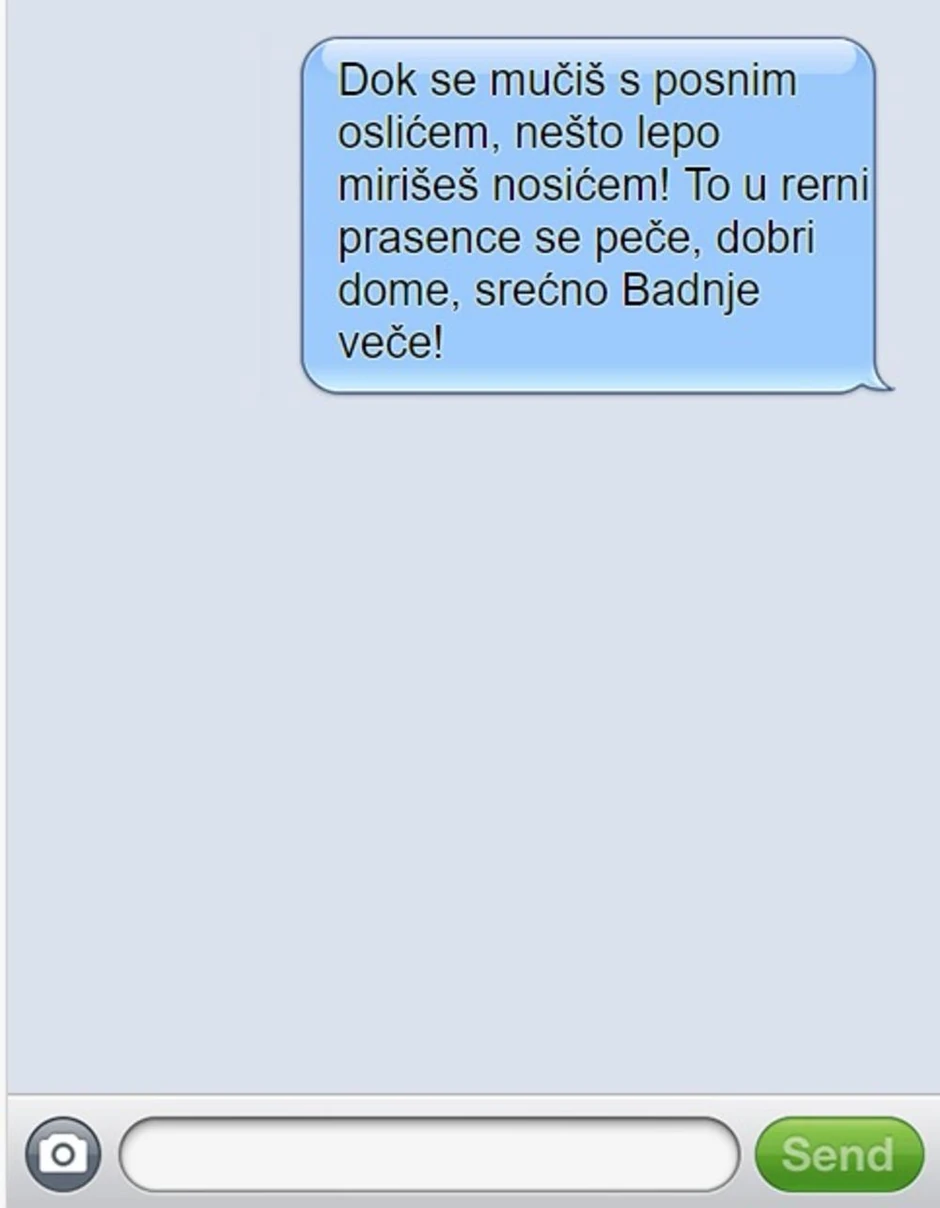 Obično se za Badnje veče kao tema poruka provlači post koji lakše pada uz saznanje da je prasence već u rerni i da je potrebno samo još malo izdržati. Nekome su takve poruke i dalje simpatične, a kako nije izglasan zakon koji to zabranjuje i kojim se propisuje sankcionisanje u vidu toga da se tom koji šalje poruke takve sadržine oduzme pečenica iz rerne, osuđeni smo i dalje na brisanje desetina sms-ova uz kolutanje očima.