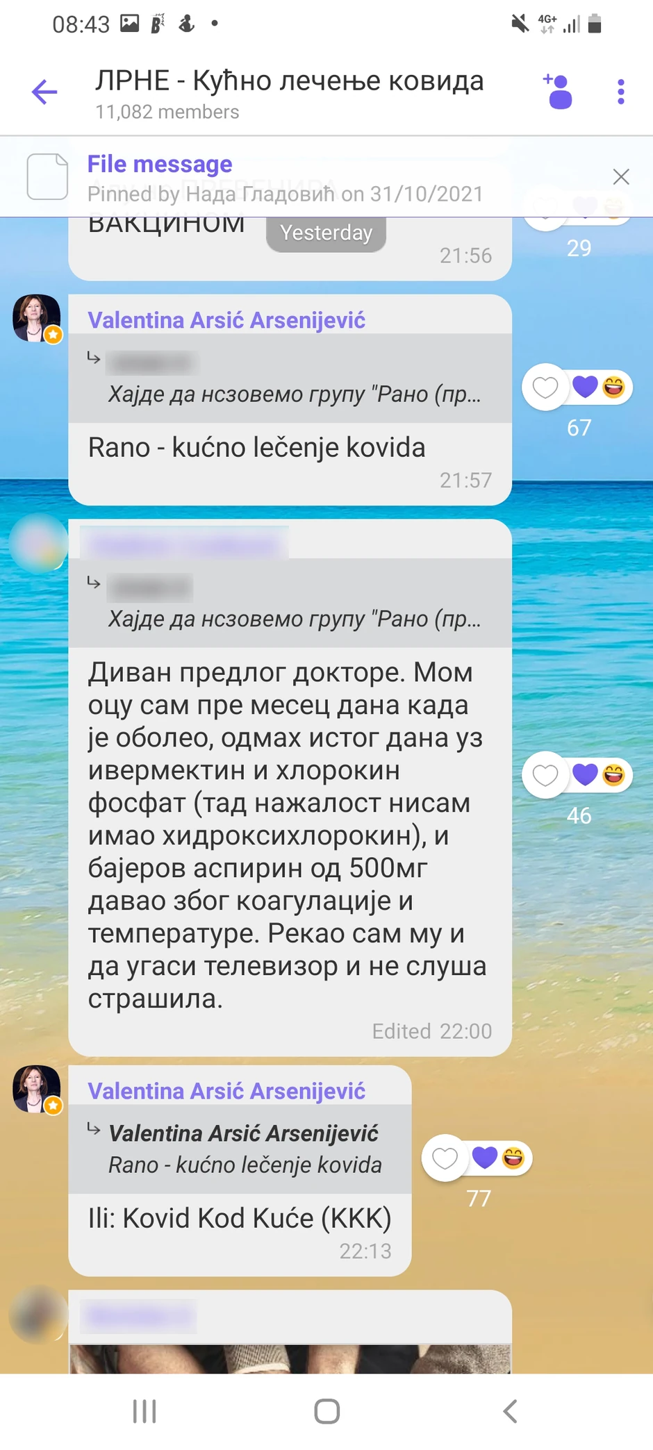 "Hajde da nazovemo grupu "Rano (prebolničko) lečenje kovida. Izbićemo im priču, uključiti Meklouga i osvetliti problem. Nije samo Ivermektin, kovid se leči na više načina, ali ne prevenira vakcinom", napisao je on, na šta je skoro pa odmah, replicirala Arsić Aresnovićeva.
