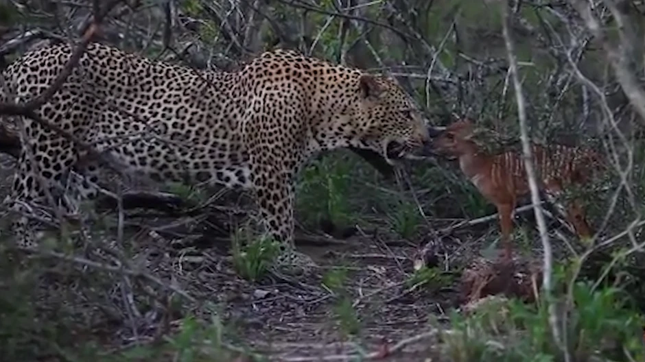 Kada je leopard konačno ustao, mala njala je ponovo nasrtala na njega i skakala. To se nastavilo neko vreme, a onda je u jednom trenutku mala antilopa pokušala da pobegne. Međutim, nije bilo šanse da pobegne. Leopardu je dosadila igra, pa ju je zgrabio za vrat i odneo.