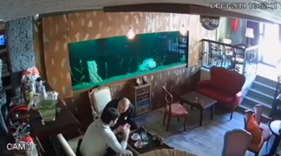 Kako se može videti na snimku, veliki akvarijum koji je postavljen u renoviranom kafiću pukao je iznenada i prekinuo ćaskanje mladića. Po onome što se može videti na snimku na sreću mladići nisu povređeni, “samo” su poliveni vodom.