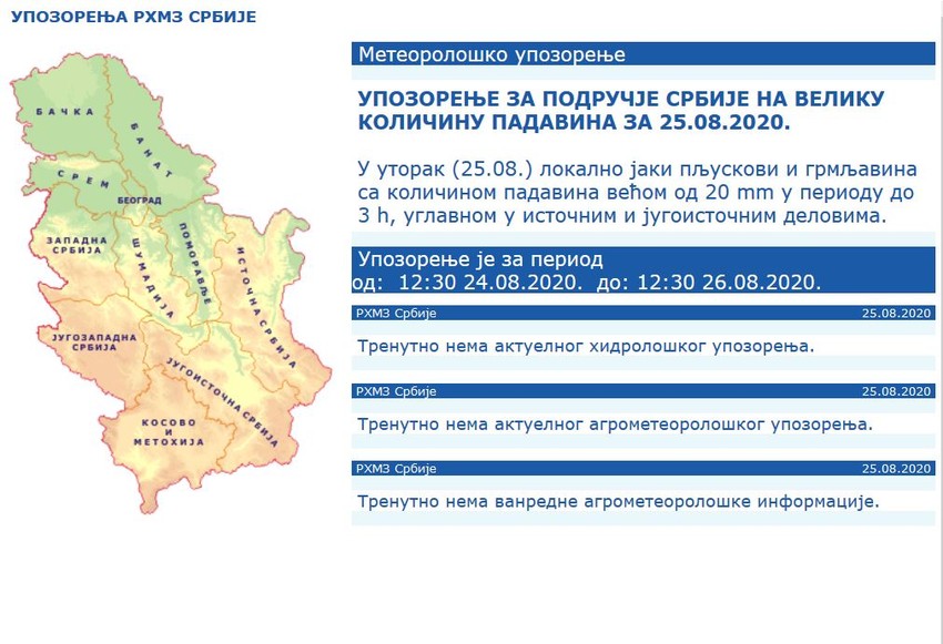 Republički hidrometeorološki zavod (RHMZ) upozorio je da se danas u Srbiji očekuju lokalno jaki pljuskovi i grmljavina sa količinom padavina većom od 20 milimetara, uglavnom u istočnim i jugoistočnim delovima.