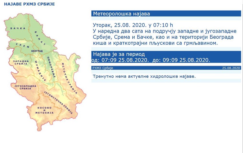 Prema najavama RHMZ-a, u naredna dva sata na području zapadne i jugozapadne Srbije, Srema i Bačke, kao i na teritoriji Beograda, očekuje se kiša i kratkotrajni plјuskovi sa grmlјavinom.
