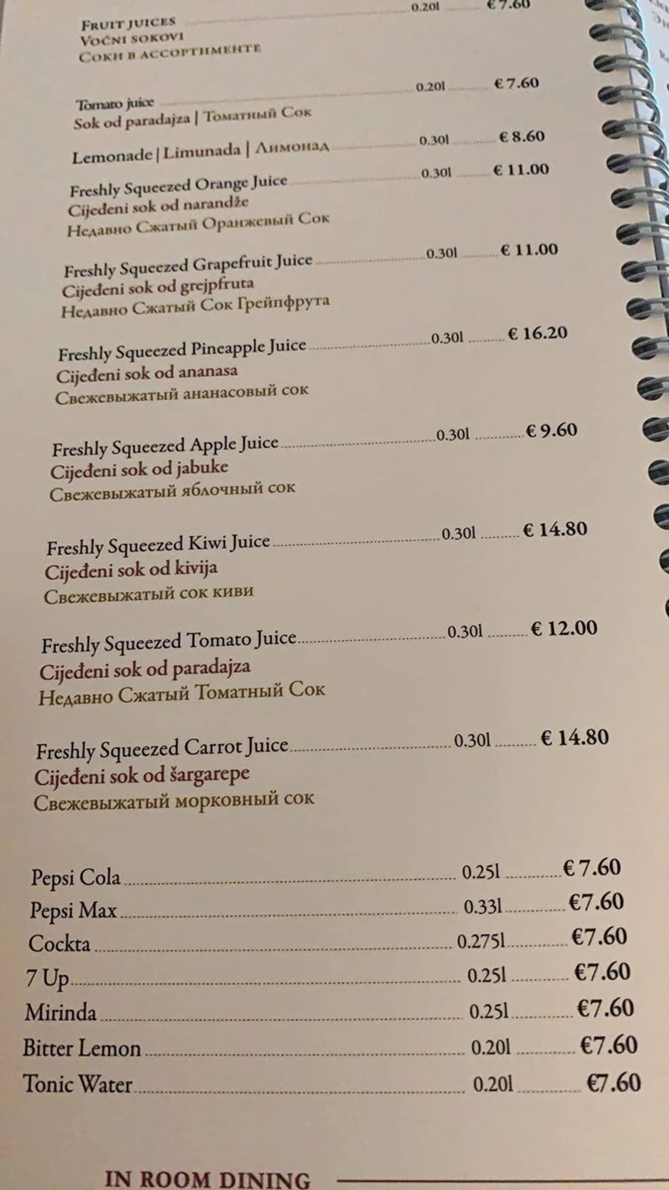 Ako ipak slučajno sednete ovde, pripremite se da za jednu limunadu izdvojite oko 900 dinara, dok je za ceđeni sok od ananasa potrebno da izdvojite čak 1.900 dinara. U slučaju da ste ljubitelj gaziranih sokova, za limenku "Pepsija" morate da izdvojite „skromnih“ 800 dinara, koliko košta i flašica "Kokte".