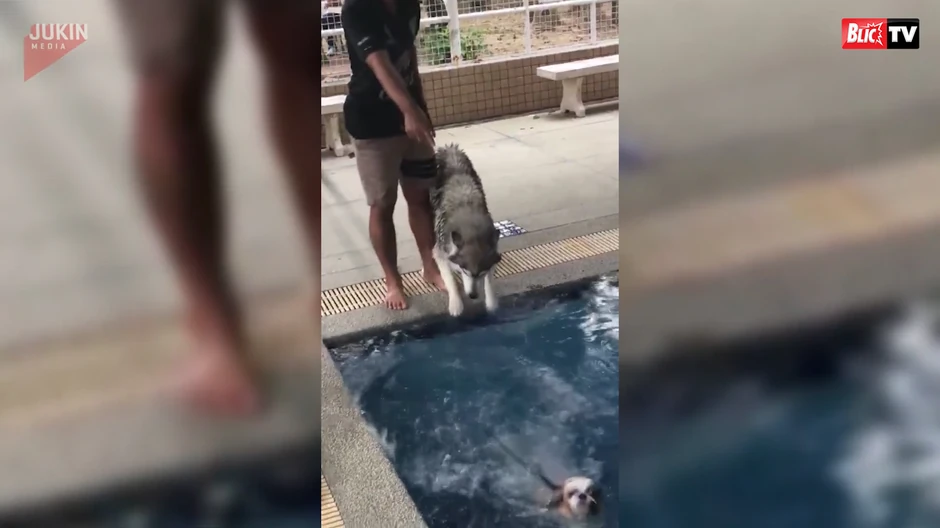 Ovaj preslatki haski se plaši ulaska u bazen...
