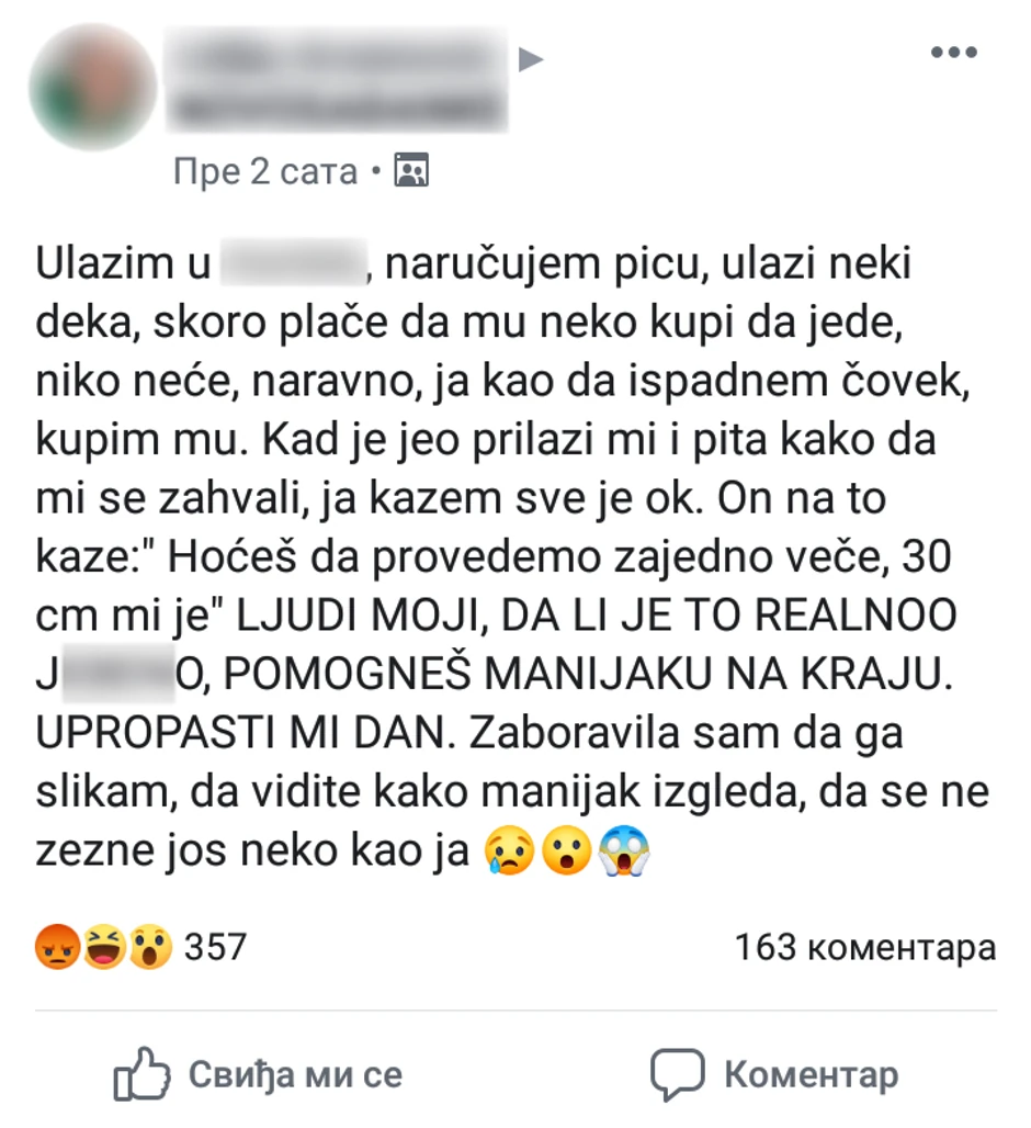 - Ulazim, naručujem picu, ulazi neki deka, skoro plače da mu neko kupi da jede. Niko neće, naravno, ja kao da ispadnem čovek, kupim mu. Kad je jeo, prilazi mi i pita kako da mi se zahvali, ja kažem sve ok. On na to kaže "Hoćeš da provedemo zajedno veče, 30 cm mi je!". Ljudi moji, da li je to realno, je*eno pomogneš manijaku na kraju. Upropasti mi dan. Zaboravila sam da ga slikam, da vidite kako manijak izgleda, da se ne zezene još neko kao ja - stajalo je u Lidijinoj objavi koja je izazvala mnoštvo komentara njenih sugrađaniki.