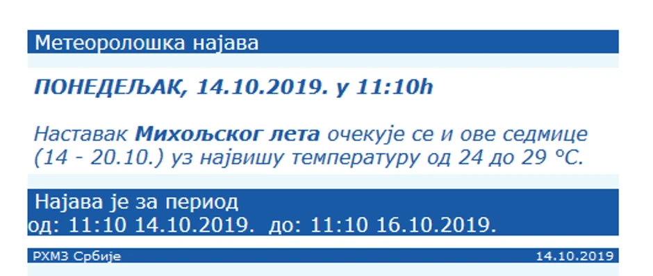 On dodaje da je oktobar prošle godine ostao upamćen kao najtopliji od kad se vrše merenja temperature u našoj zemlji, te ostaje da vidimo na kraju meseca da li će ovaj oktobar premašiti rekord prošlog.