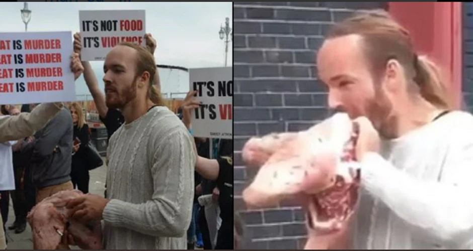 Ispred Centra "Brajton", izložbene i konferencijske dvorane u istoimenom gradu u kojoj je održan festival veganske ishrane VegFest, snimljen je muškarac kako odgriza komade mesa iz sirove svinjske glave.