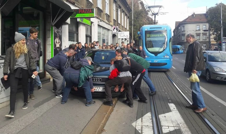 "Audi", parkiran ispred picerije kod Trga Franje Tuđmana, sprečio je prolazak tramvaja broj 11, ali brojni putnici i prolaznici odlučili su da problematično vozilo uklone vlastitim rukama, prenosi Jutarnji list.