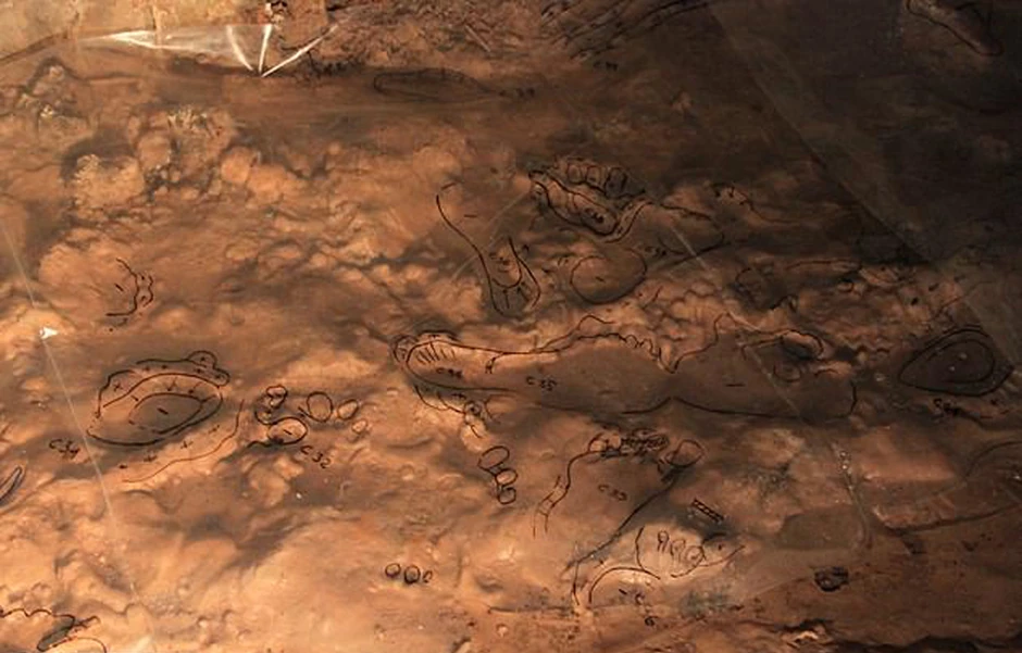 Tlo pećine, koja pripada čuvenoj grupi Tojrano, prekriva najmanje 180 otisaka šaka, kolena i stopala koji ukazuju na to su ljudi "četvoronoške" prolazili kroz niske tunele.