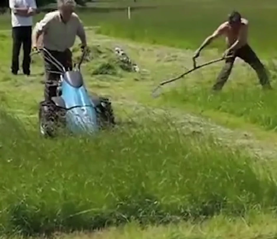 Pogledajte takmičenje dvojice kosača, jednog kako kosi ručno i drugog uz pomoć električne kosilice. Izgledalo je lako, ali je i ovaj put puž pobedio zeca.