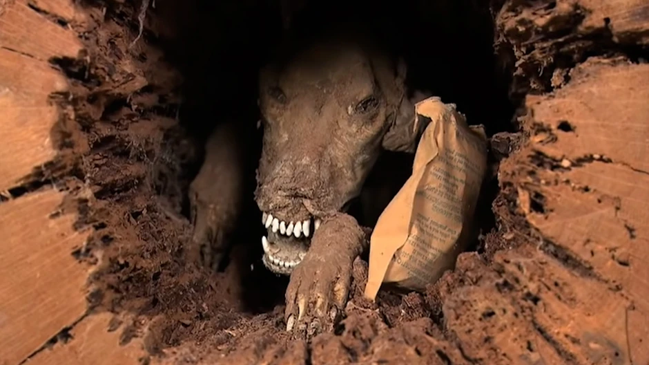 Kada su drvoseče nakon rušenja starog kestena 1980. godine krenuli da seku drvo naišli su na strašno otkriće. U šupljini starog drveta bio je mumificirani lovački pas.