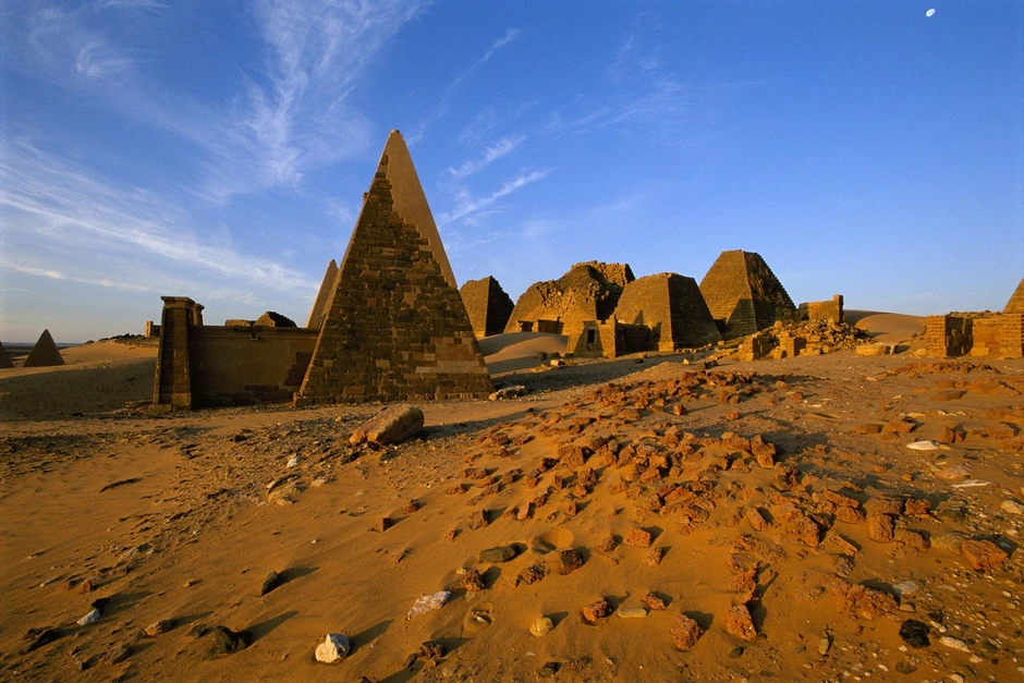 Sredinom šestog veka pre nove ere Meroe je bio glavni grad nubijske dinastije Kuš, “crnih faraona”, koji su vladali područjem od Asuana, na jugu Egipta, do današnjeg Kartuma. Na izvestan način, Nubijci su bili i protivnici i saveznici starih Egipćana i prihvatili su mnoge njihove rituale, kao što je sahranjivanje vladara i uglednih građana u grobnicama u obliku piramida.