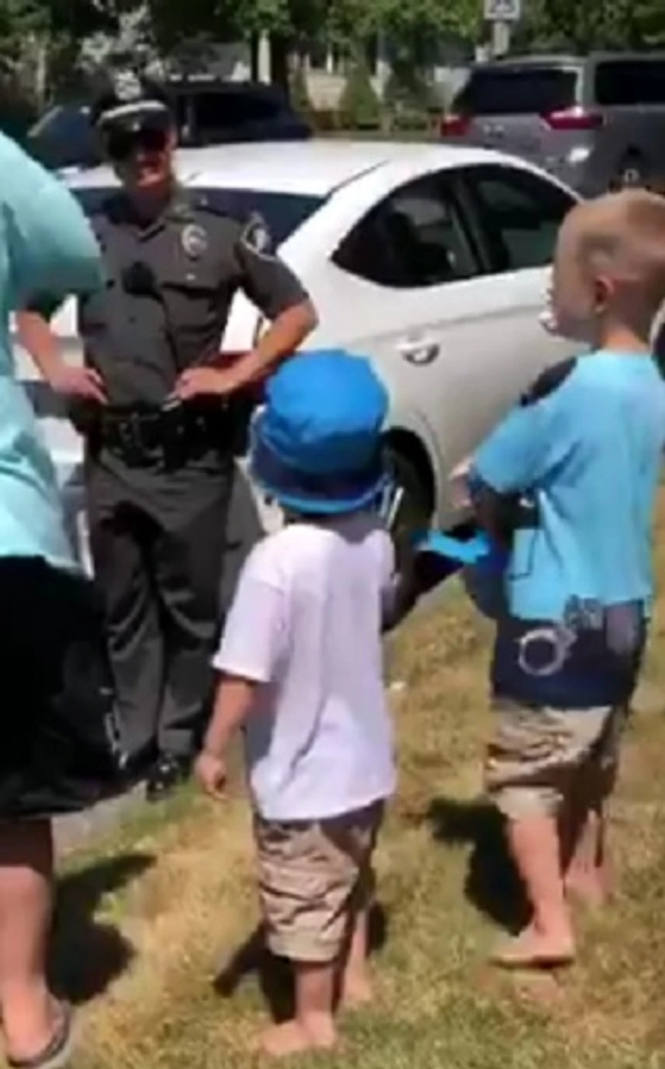 Međutim, obojica su bila više nego iznenađena kad su se pravi policajci pojavili na njihovim vratima. Na snimku koji je na internetu objavila njihova tetka Britani vidi se kako policajci prilaze, a jedan od njih daje dečacima rođendansku čestitku.