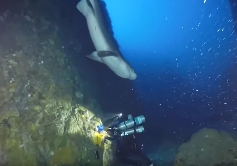 Roka i Pinheiro otkrili su novu vrstu ribe dok su ronili, ali snimak koji je načinio njihov čuvar otkrio je nešto sasvim neočekivano – šestoškrgu ajkulu (Hexanchus griseus) kako pliva tačno iznad njihovih glava.