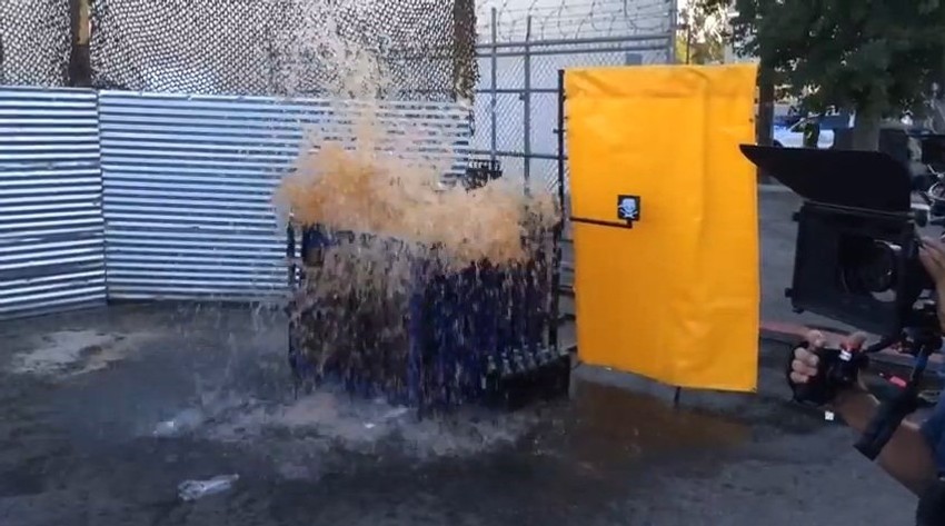 Ubrzo, on seda na dasku iznad bazena punjenog dijetalnom kolom, koja se automatski spušta čim neko pogodi metu pored bazena.