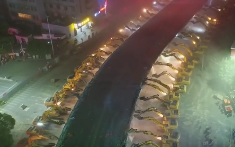 Kineski građevinski radnici izveli su neverovatno maštovit i ozbiljan poduhvat rušenja 500 metara dugog nadvožnjaka u kineskom gradu Nančangu sa više od 100 bagera odjednom uključenih u akciju.