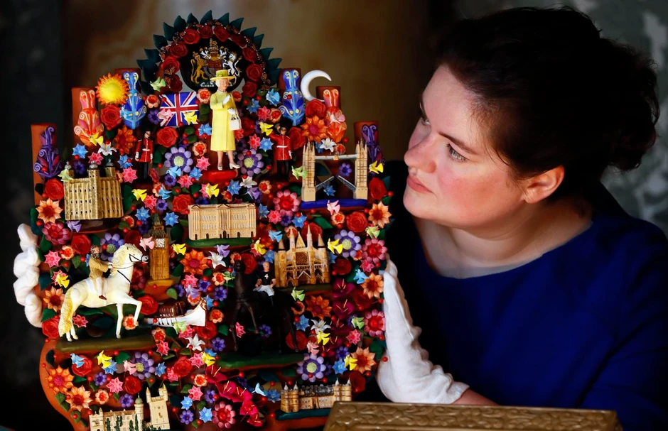 Tu su vaze iz Uzbekistana, ukrašene portretima kraljice i njenog supruga, pletena tašnica od kokosovih vlakana sa Maršalskih ostrva, srebrni servis za čaj iz Mjanmara, crvene vunene rukavice s jednim prstom iz Kanade i Brandenburška kapija od porcelana iz Nemačke.