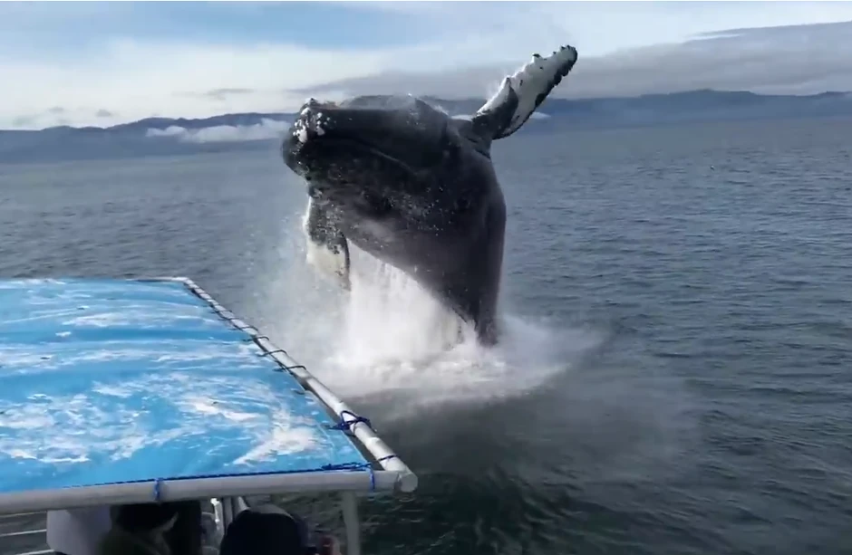 Neverovatna scena oduševila je sve prisutne, ali u istom ih je i uplašila jer su ubrzo postali svesni da je ogrmona životinja mogla lako da potopi brod, samo da je skočila koji centimetar bliže.