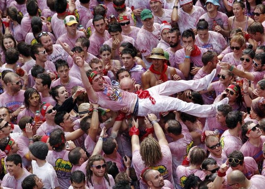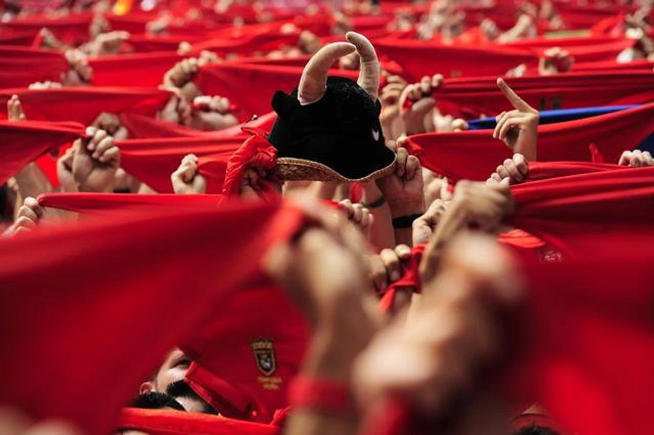 Desetine hiljada ljudi u Pamploni u Španiji prskali su danas jedni druge belim vinom i mahali crvenim maramama, na početku ovogodišnje trke sa bikovima, koji je označen ispaljivanjem male rakete.